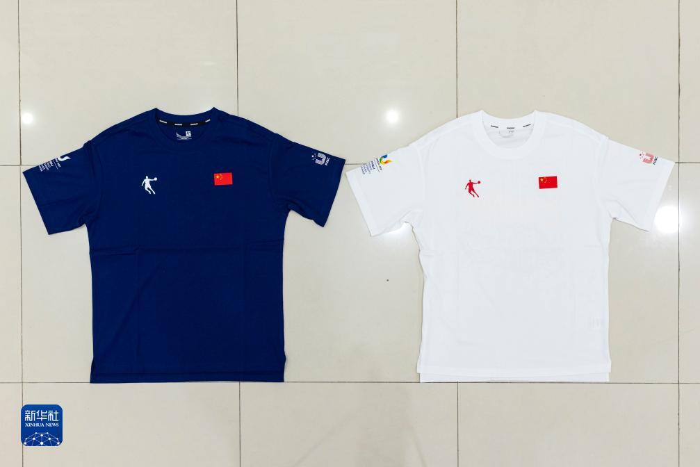 這是7月24日拍攝的第31屆世界大學(xué)生夏季運動(dòng)會(huì )中國代表團成員配發(fā)裝備中的短T恤衫。