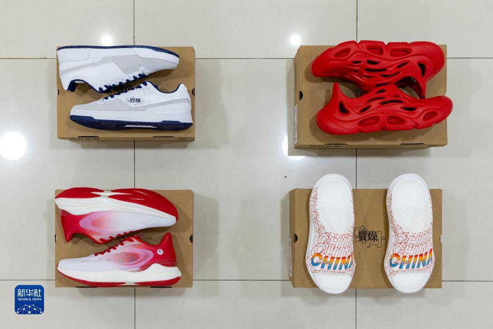 這是7月24日拍攝的第31屆世界大學(xué)生夏季運動(dòng)會(huì )中國代表團成員配發(fā)裝備中的不同功能的鞋。