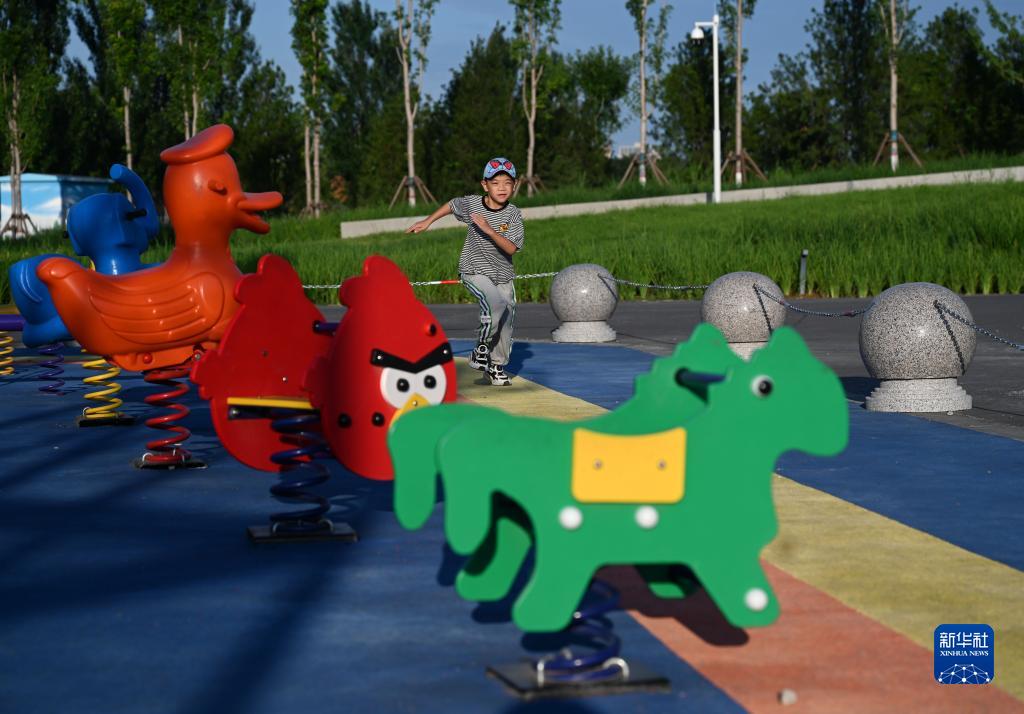 7月25日,小朋友在白溝新城一處“口袋公園”玩耍。