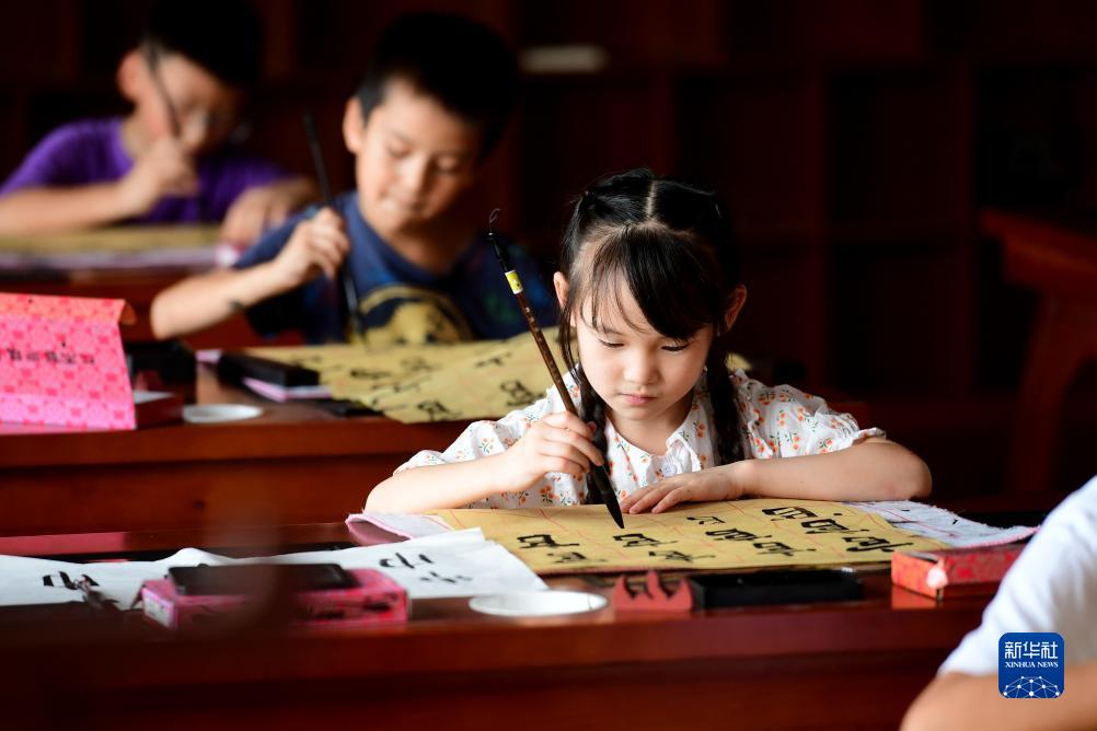 7月25日,孩子們在合肥市肥西縣紫蓬鎮中心學(xué)校少年宮練習書(shū)法。