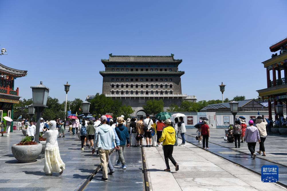 游客在正陽(yáng)門(mén)箭樓前的前門(mén)大街參觀(guān)游覽(7月6日攝)。正陽(yáng)門(mén)是中國明、清兩代王朝都城的正南門(mén),坐落在老北京城的南北中軸線(xiàn)上,俗稱(chēng)前門(mén)。1988年,正陽(yáng)門(mén)城樓和箭樓被國務(wù)院批準列入第三批全國重點(diǎn)文物保護單位。