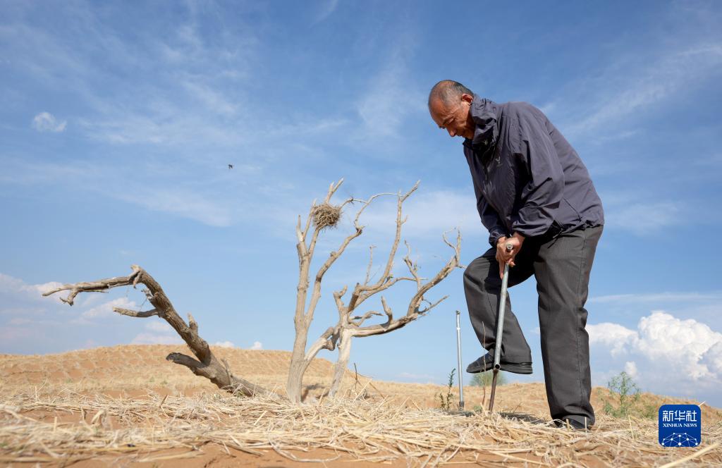 7月19日,中衛市西郊林場(chǎng)場(chǎng)長(cháng)唐希明在栽種技術(shù)處理過(guò)的灌木苗,進(jìn)行夏季雨季造林試驗。如果成功,可實(shí)現春、夏、秋三季造林。