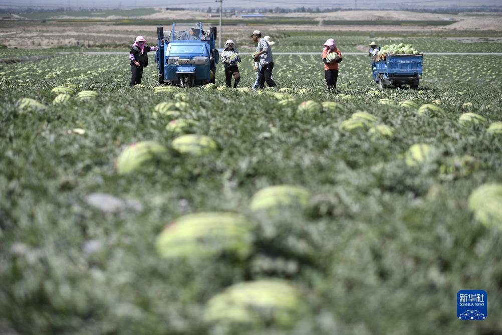 7月21日,農戶(hù)在寧夏中衛市沙坡頭區興仁鎮田間采摘硒砂瓜(無(wú)人機照片)。