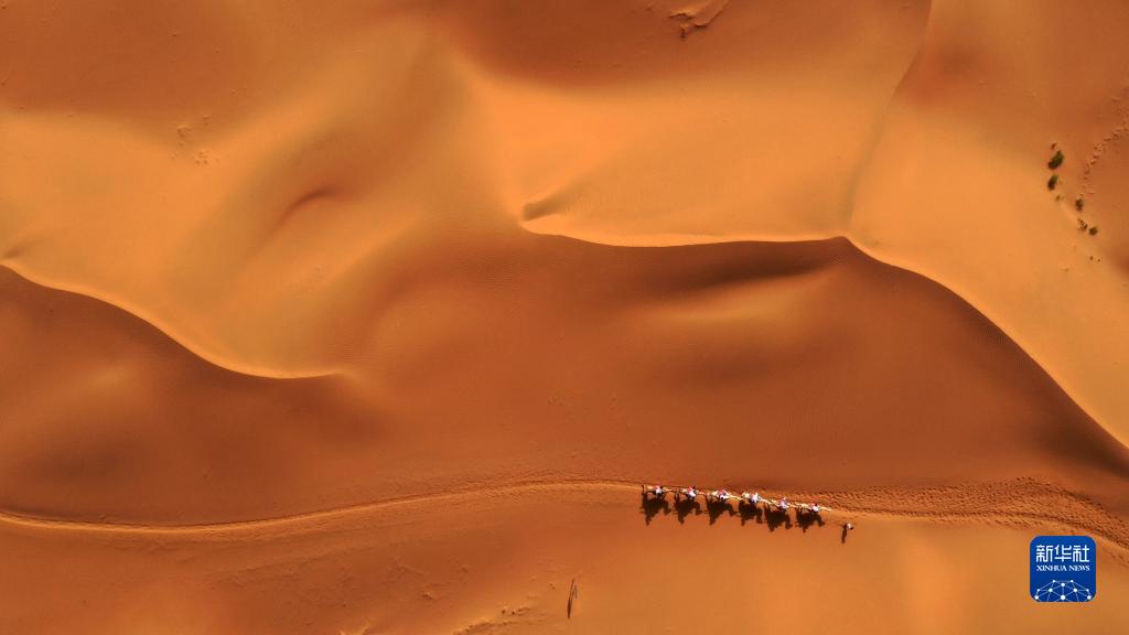 7月20日,游客在中衛市沙坡頭景區騰格里沙漠體驗沙漠騎駱駝(無(wú)人機照片)。