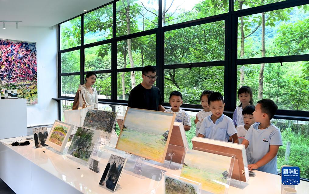 參加研學(xué)的小學(xué)員在陜西省漢中市留壩縣小留壩村樓房溝玉雙美術(shù)館內參觀(guān)(7月24日攝)。