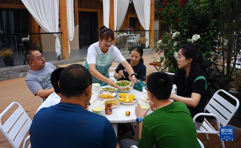 游客在陜西省漢中市留壩縣紫柏街道小留壩村的一家民宿內吃早餐(7月24日攝)。