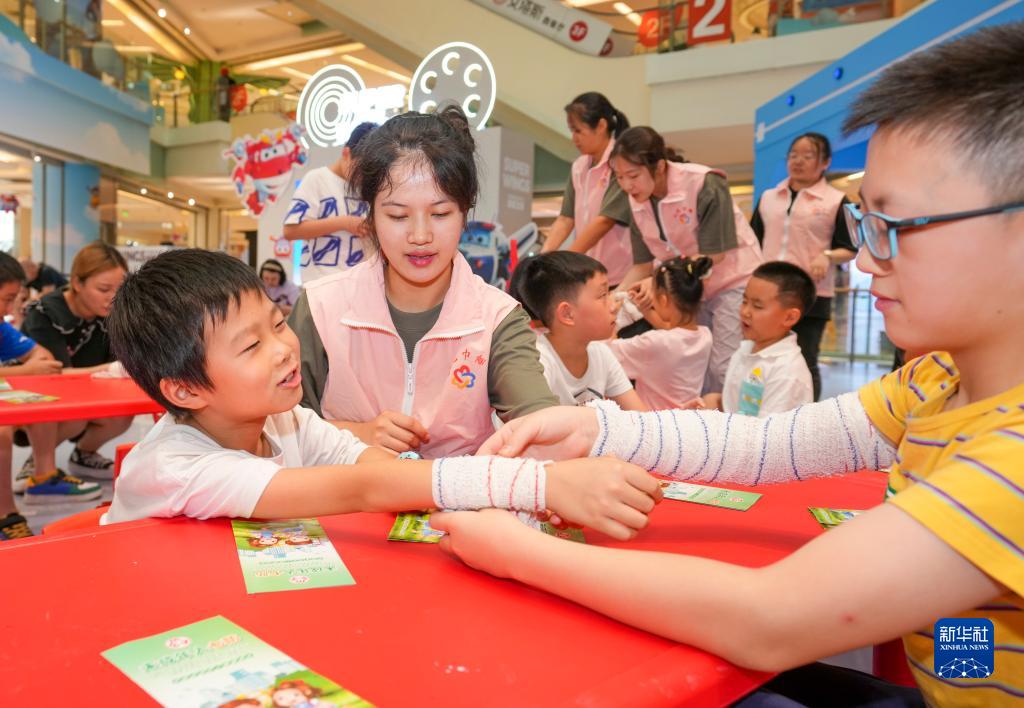 7月25日,在重慶市九龍坡區楊家坪街道一商場(chǎng)的預防溺水安全教育社區服務(wù)點(diǎn),青少年在巾幗志愿者的指導下體驗簡(jiǎn)易包扎技能。