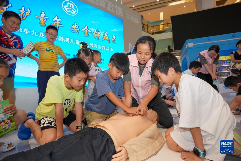 7月25日,在重慶市九龍坡區楊家坪街道一商場(chǎng)的預防溺水安全教育社區服務(wù)點(diǎn),青少年在巾幗志愿者的指導下體驗心肺復蘇操作技能。