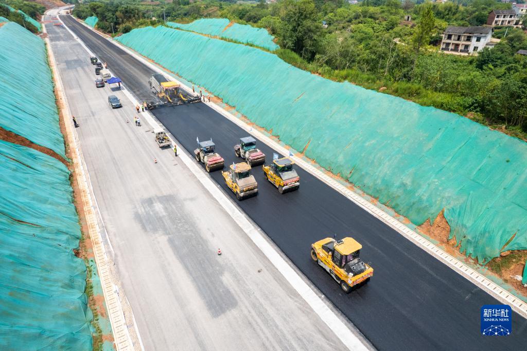 這是7月25日拍攝的衡永高速路面工程施工現場(chǎng)(無(wú)人機照片)。