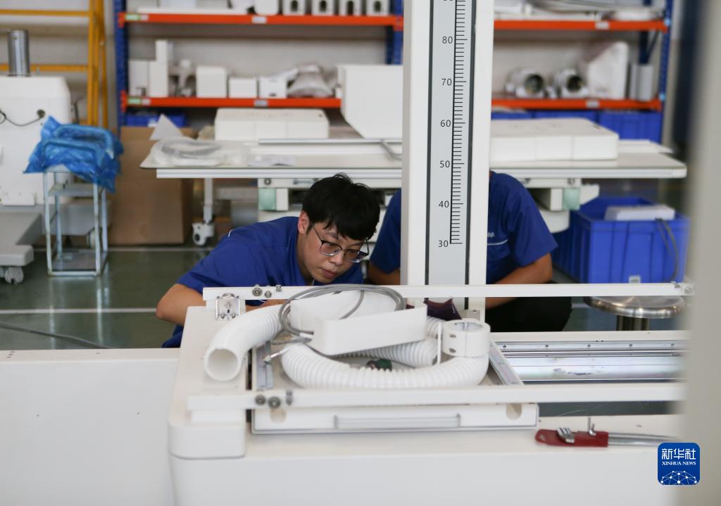 7月25日,在位于淄博市高新區的山東新華醫療器械股份有限公司,工作人員在車(chē)間組裝醫療設備。