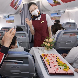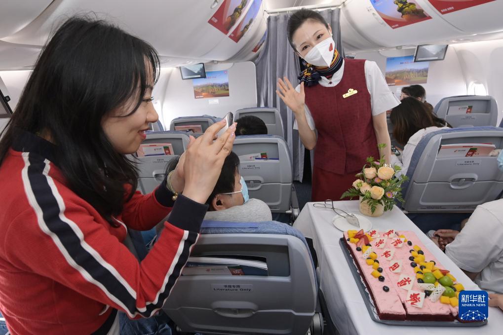 7月25日,乘務(wù)人員在北京飛往和田的首航航班上為乘客準備了慶祝首航的蛋糕。