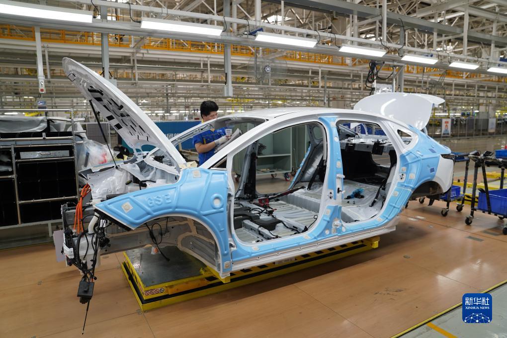 在位于江西省南昌市經(jīng)開(kāi)區的江鈴集團新能源汽車(chē)有限公司生產(chǎn)基地車(chē)間內,工人在生產(chǎn)線(xiàn)上作業(yè)(7月18日攝)。新華社記者 周密 攝