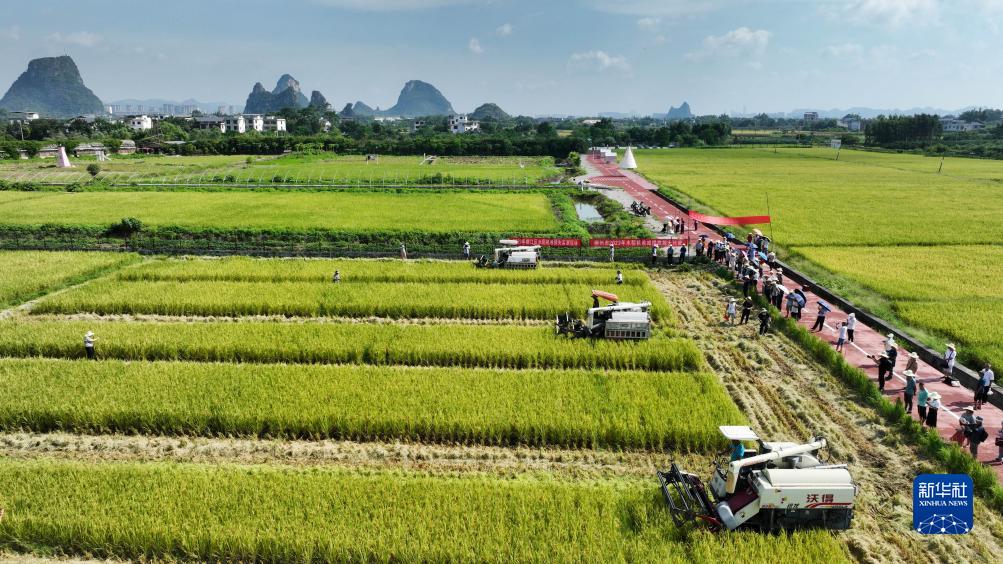 7月25日,在柳州市柳江區進(jìn)德鎮泗浪村,農機手駕駛收割機參與水稻機收減損技能比武(無(wú)人機照片)。新華社發(fā)(黎寒池 攝)