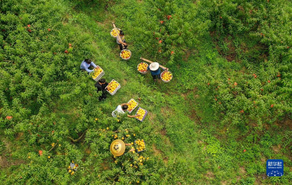 7月25日,果農在貴州省玉屏侗族自治縣朱家場(chǎng)鎮混寨村黃桃基地采收黃桃(無(wú)人機照片)。新華社發(fā)(胡攀學(xué) 攝)