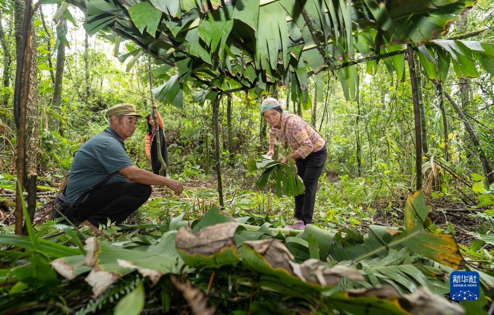 7月23日,張普忠(左)和老伴王素英在搭建芭蕉葉棚子。新華社記者 費茂華 攝