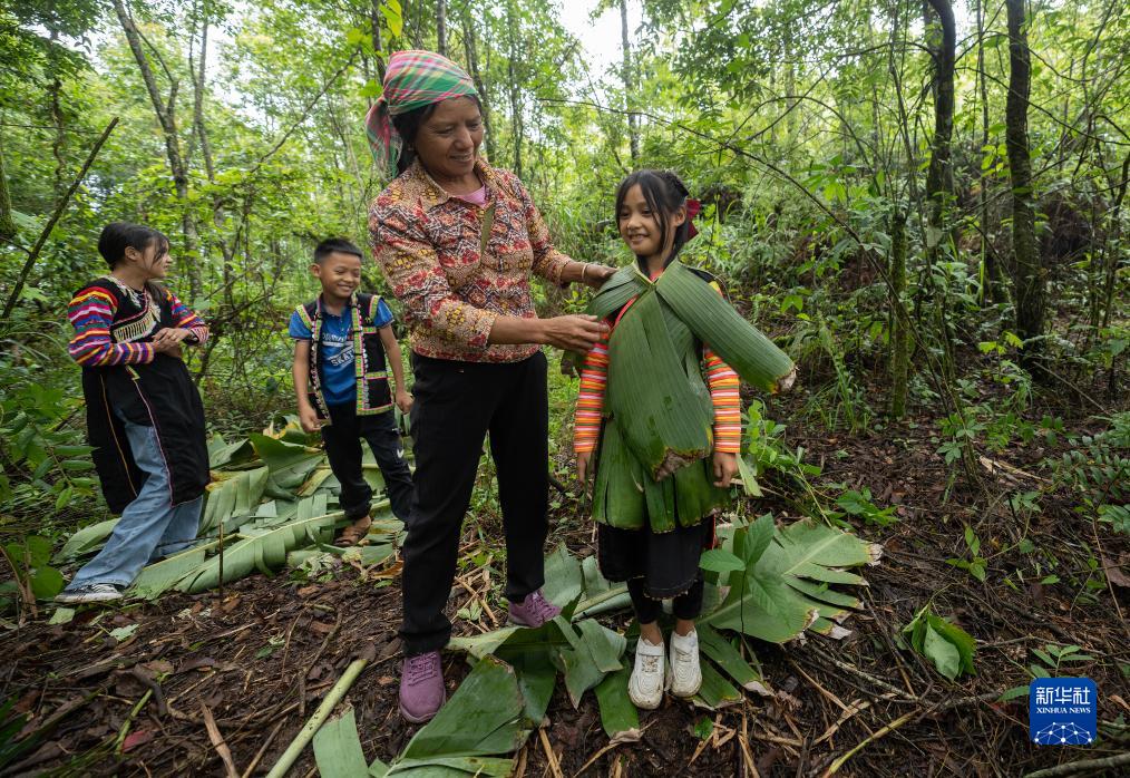 7月23日,張普忠的老伴王素英(右二)用芭蕉葉為小孫女張麗紅制作“衣服”。新華社記者 費茂華 攝