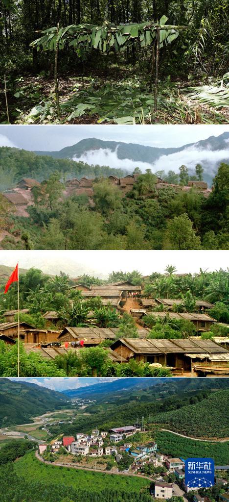 這張拼版照片展示了苦聰人住房的變化:上圖一為2023年7月23日張普忠老人根據自己記憶還原的當年苦聰人還處在原始社會(huì )時(shí)在森林里搭建的芭蕉葉棚子(新華社記者費茂華攝);上圖二為1984年金平縣頂青公社苦聰村寨里的茅草房(新華社記者閔福全攝);上圖三為2001年11月拍攝的金平縣者米鄉下納咪村苦聰山寨嶄新的石棉瓦房(新華社記者藺以光攝);下圖為2023年7月23日拍攝的金平縣者米鄉興發(fā)嶺村(新華社記者陳欣波攝)。新華社記者 費茂華 攝