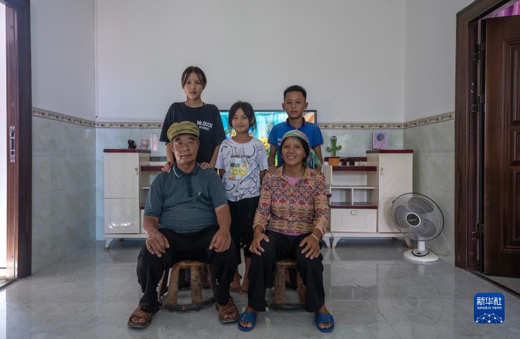 7月23日,張普忠(前左)、老伴王素英(前右)、大孫女張英(后左)、孫子張偉軍(后右)和小孫女張麗紅(中)在新居中合影。新華社記者 費茂華 攝