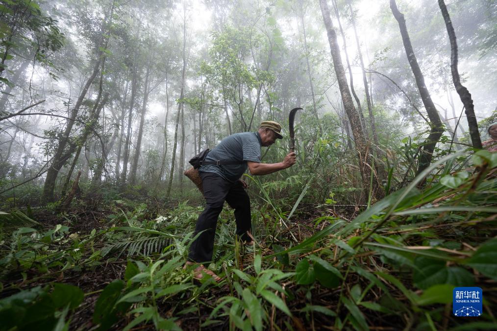 7月23日,張普忠砍開(kāi)藤蔓和灌木,準備前往自己曾經(jīng)住過(guò)的新民寨。新華社記者 費茂華 攝