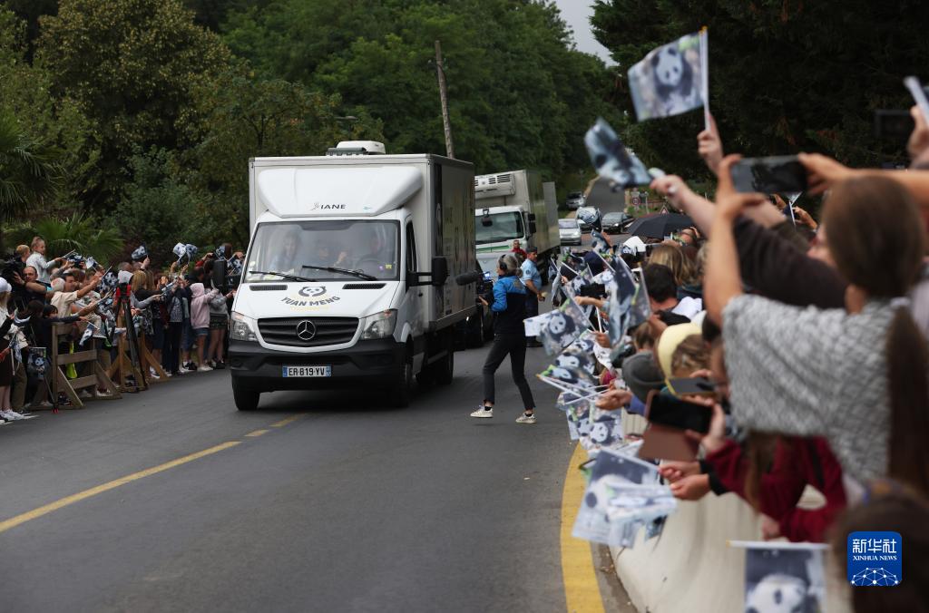 7月25日,在法國圣艾尼昂市博瓦勒野生動(dòng)物園外,人們送別搭載熊貓“圓夢(mèng)”的車(chē)離開(kāi)。