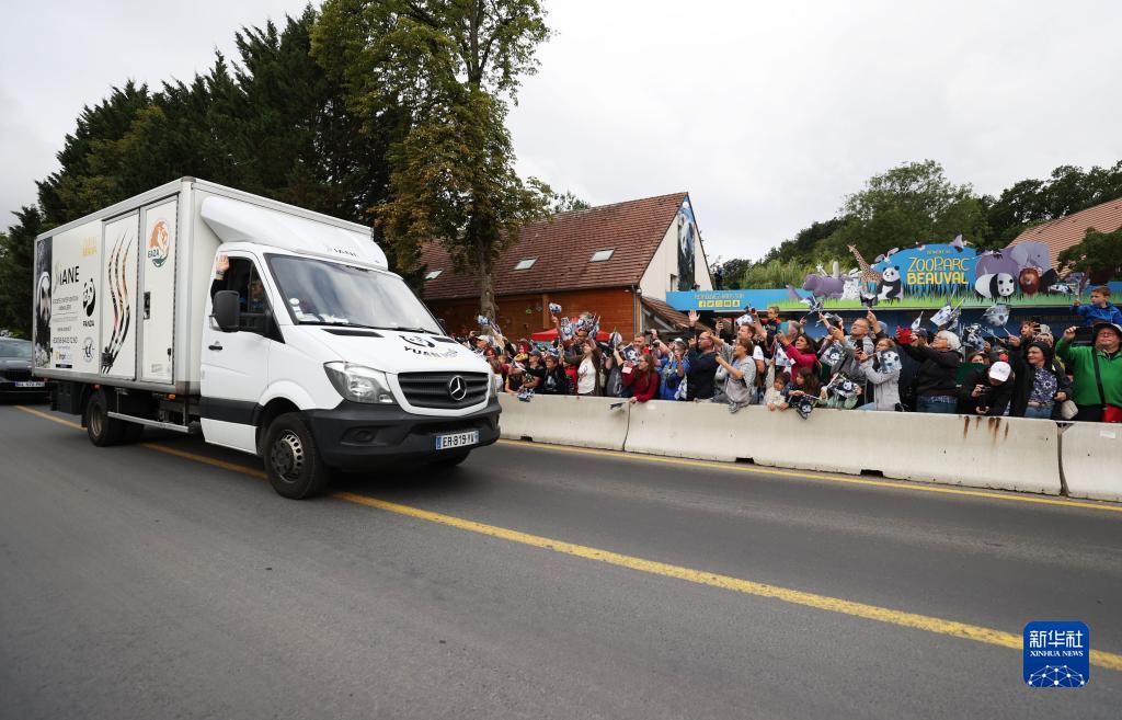 7月25日,在法國圣艾尼昂市博瓦勒野生動(dòng)物園外,人們送別搭載熊貓“圓夢(mèng)”的車(chē)離開(kāi)。