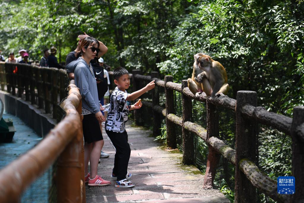 7月24日,在張家界國家森林公園十里畫(huà)廊景區,游客和獼猴互動(dòng)。