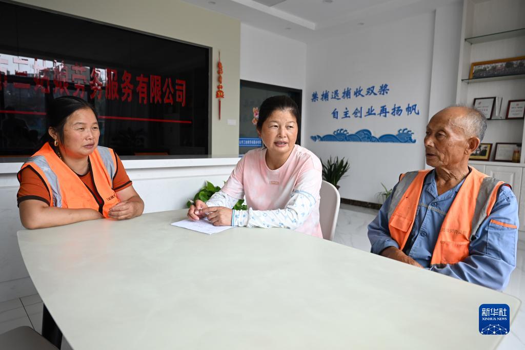 7月24日,在馬鞍山市三姑娘勞務(wù)服務(wù)有限公司,陳蘭香(中)和工作人員交流。新華社記者 周牧 攝