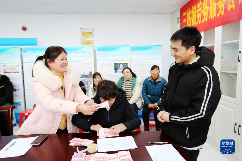 在馬鞍山市三姑娘勞務(wù)服務(wù)有限公司的股東分紅大會(huì )上,陳蘭香(左一)將錢(qián)分給員工(2022年1月29日攝)。新華社發(fā)(畢琛攝)