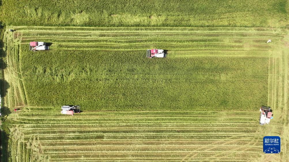 在江西省南昌市新建區聯(lián)圩鎮連前村,當地農戶(hù)在田間收割早稻(7月24日攝,無(wú)人機照片)。