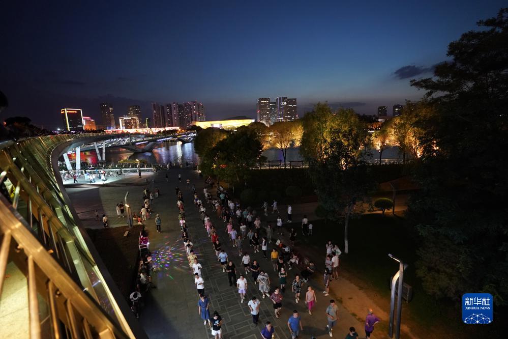 人們在太原市汾河景區跳舞(7月25日攝)。