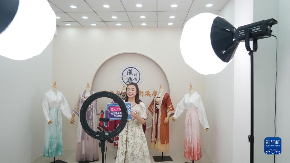 7月25日,在山東曹縣一家生產(chǎn)漢服的公司內,主播正在向網(wǎng)友推介漢服產(chǎn)品。