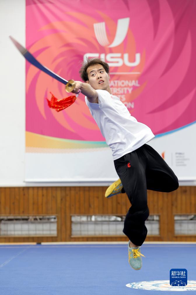 7月25日,參加第31屆世界大學(xué)生夏季運動(dòng)會(huì )武術(shù)比賽的中國選手金哲典在成都城北體育館訓練。