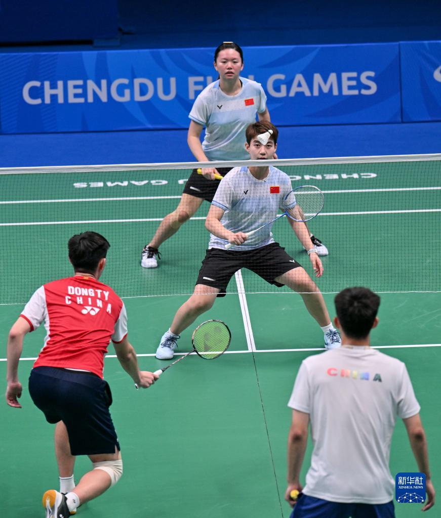 7月25日,中國代表團選手在雙流體育中心體育館進(jìn)行羽毛球賽前訓練。