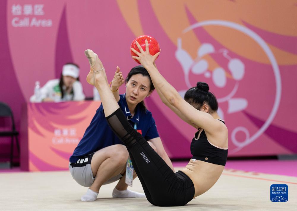 7月25日,成都大運會(huì )中國大學(xué)生藝術(shù)體操隊集體項目主教練任爽(左)在成都體育學(xué)院體操館指導隊員訓練。