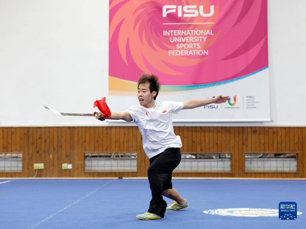 7月25日,參加第31屆世界大學(xué)生夏季運動(dòng)會(huì )武術(shù)比賽的中國選手金哲典在成都城北體育館訓練。