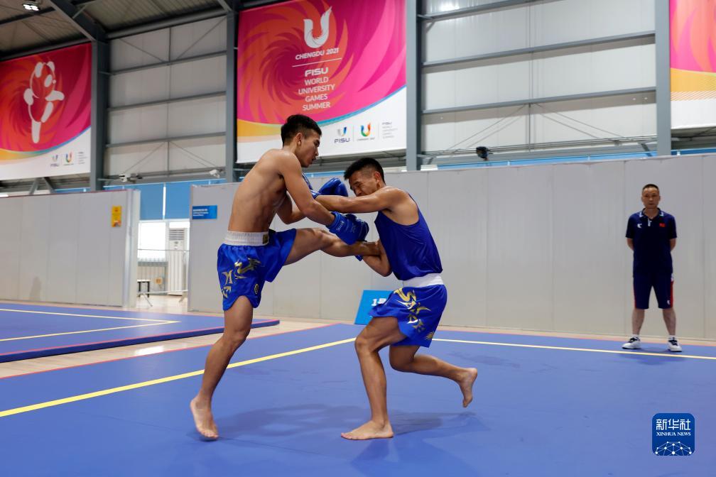 7月25日,參加第31屆世界大學(xué)生夏季運動(dòng)會(huì )武術(shù)散打比賽的中國選手在成都城北體育館訓練。