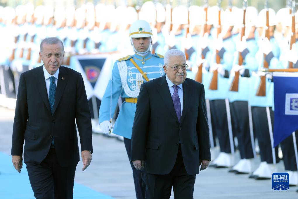 7月25日,土耳其總統埃爾多安(左)在安卡拉歡迎到訪(fǎng)的巴勒斯坦國總統阿巴斯(右)。