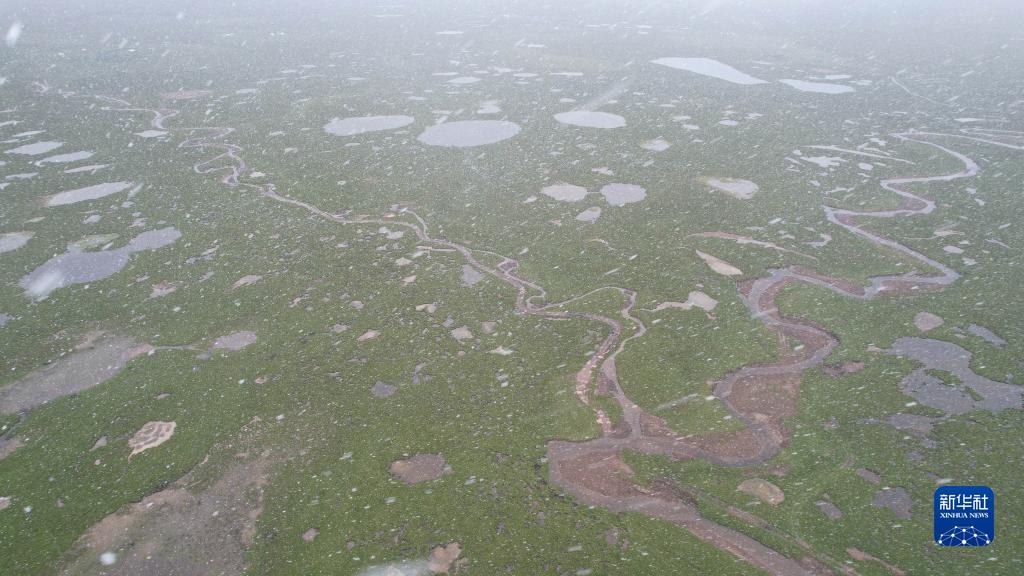 風(fēng)雪彌漫中的當曲濕地(7月24日攝,無(wú)人機照片)。