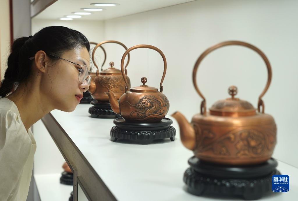 參觀(guān)者在江西中鼎金屬工藝有限公司的展廳里觀(guān)賞銅壺工藝品(7月13日攝)。