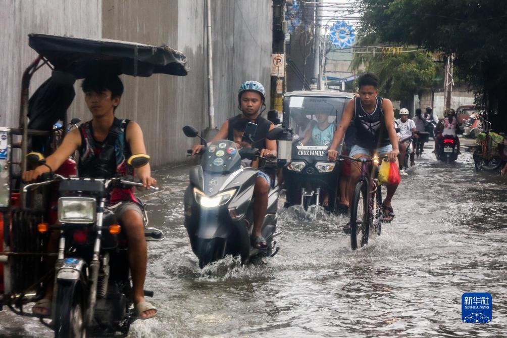 7月26日,人們在菲律賓馬拉邦一處積水的街道涉水而行。