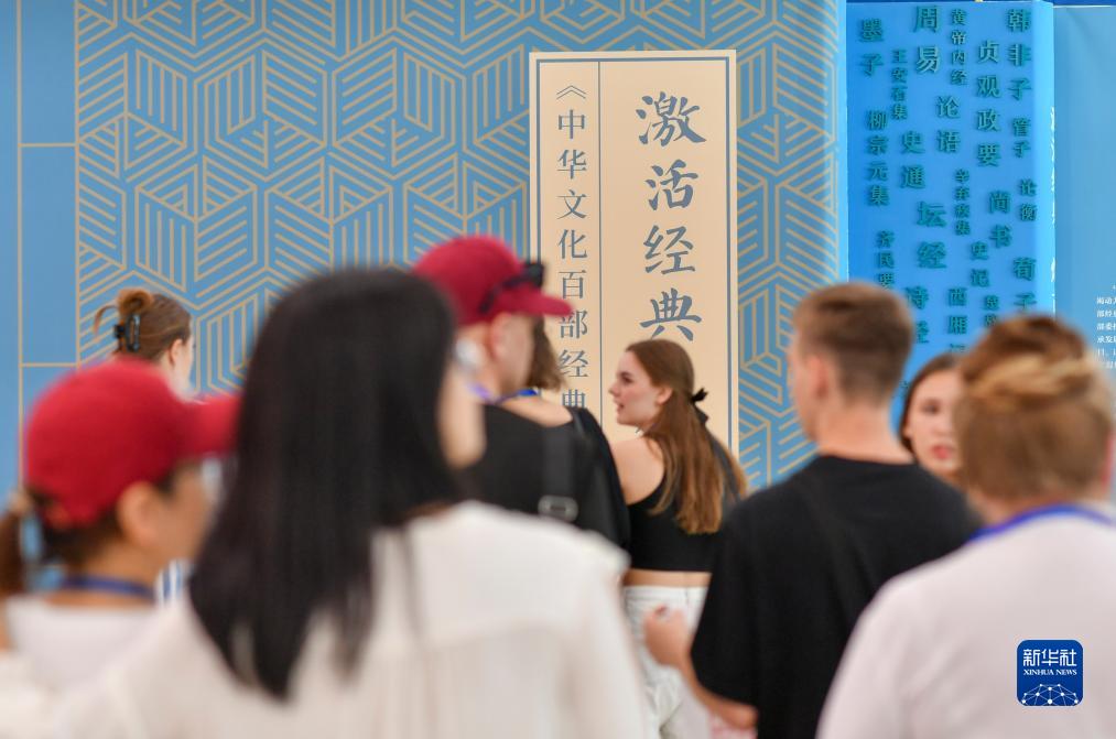 俄羅斯薩拉托夫州曙光歌舞團的歌舞演員在新疆圖書(shū)館參觀(guān)(7月23日攝)。