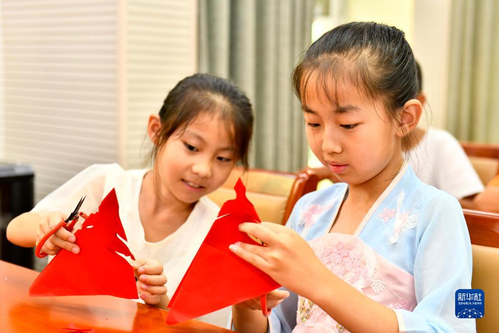 7月26日,在莒縣城陽(yáng)街道岳家村“小草學(xué)堂”,孩子們在學(xué)習剪紙。