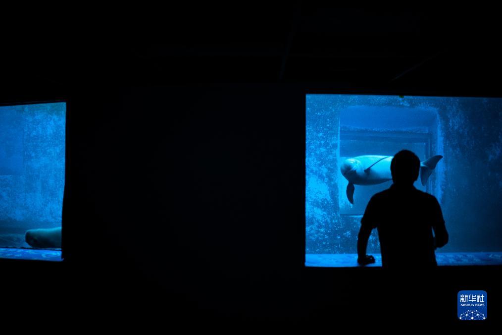 7月12日,中國科學(xué)院水生生物研究所研究人員觀(guān)察館內的長(cháng)江江豚。