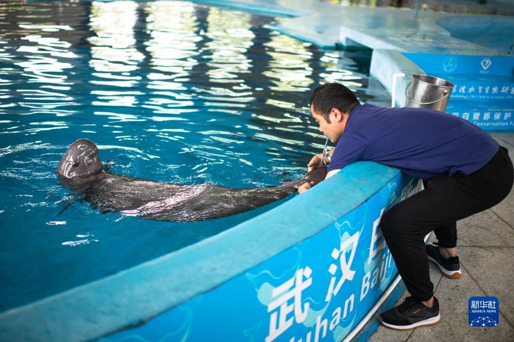 7月12日,中國科學(xué)院水生生物研究所白鱀豚館訓練員王超群對一頭長(cháng)江江豚進(jìn)行訓練。