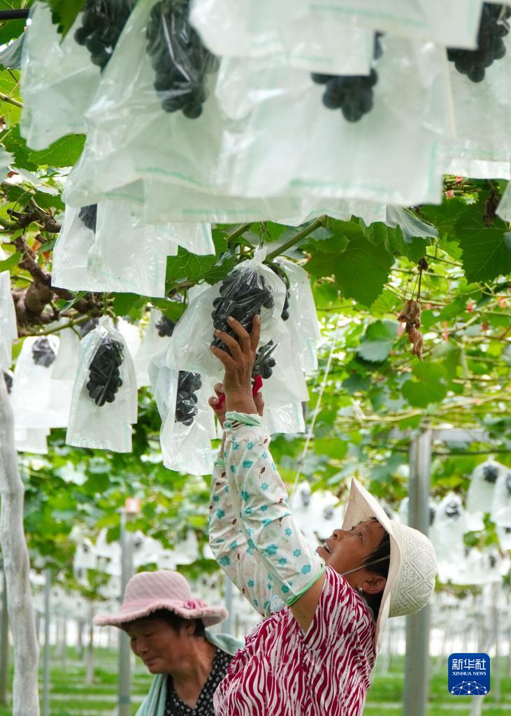 7月26日,在山東省新泰市樓德鎮,果農在高標準葡萄大棚里收獲成熟的葡萄。