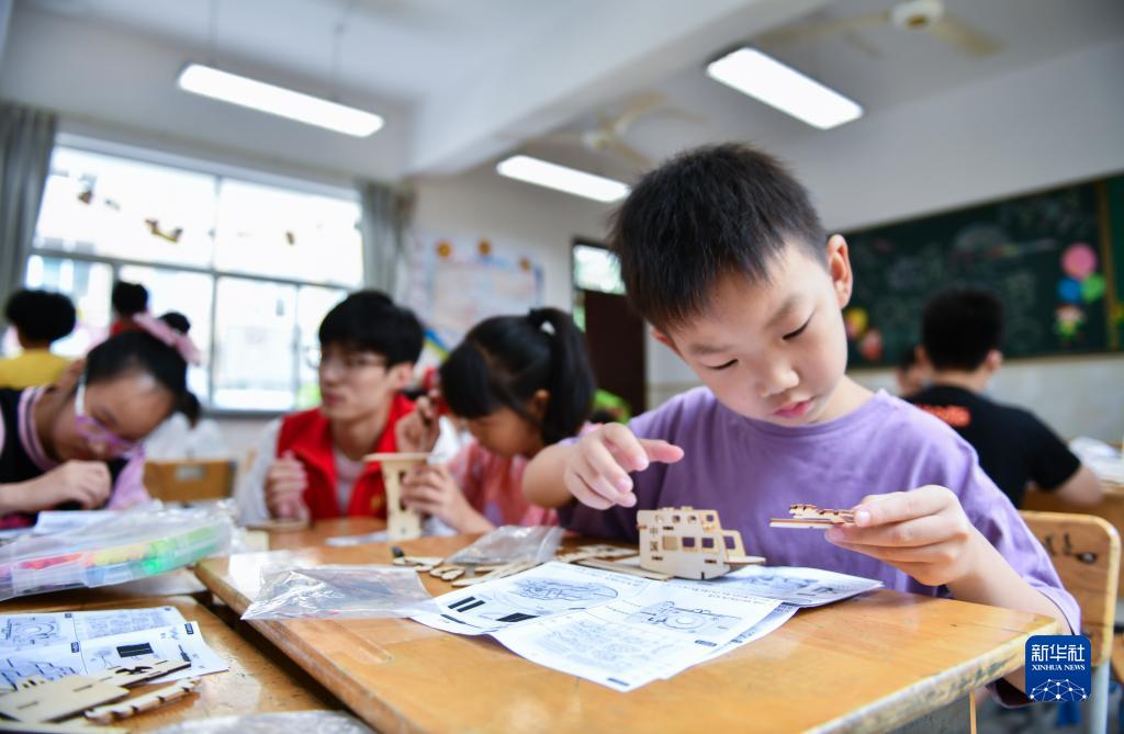7月27日,在余姚市舜北小學(xué)暑托班內,孩子們在制作太陽(yáng)能科學(xué)實(shí)驗裝置。