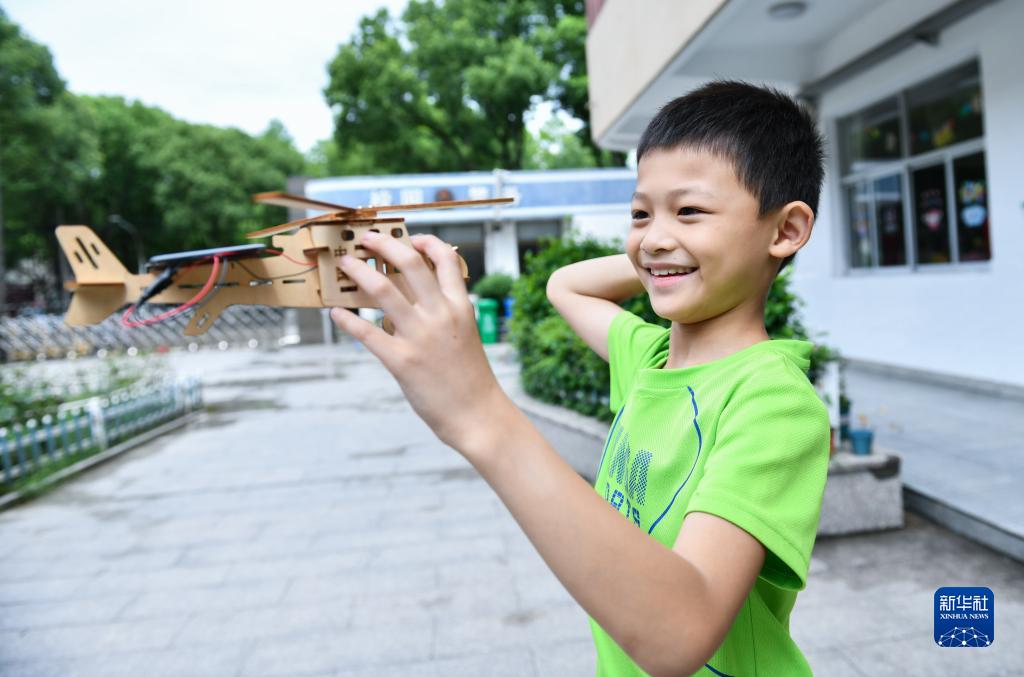 7月27日,余姚市舜北小學(xué)暑托班的孩子在展示自己的太陽(yáng)能小作品。