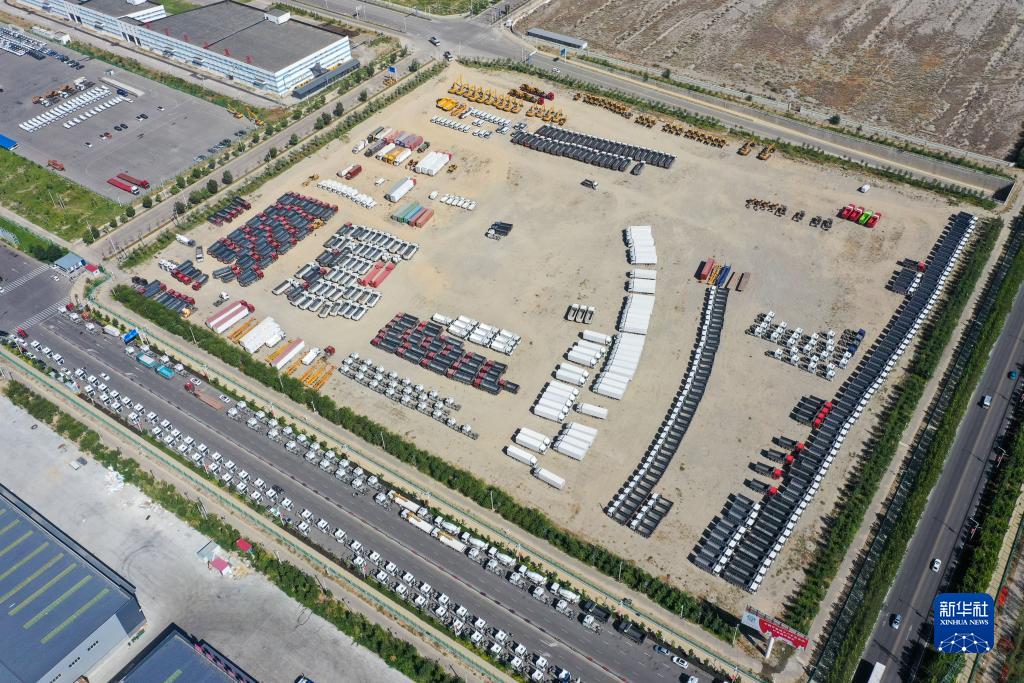 這是7月26日在新疆霍爾果斯口岸拍攝的準備出口的國產(chǎn)商品車(chē)(無(wú)人機照片)。