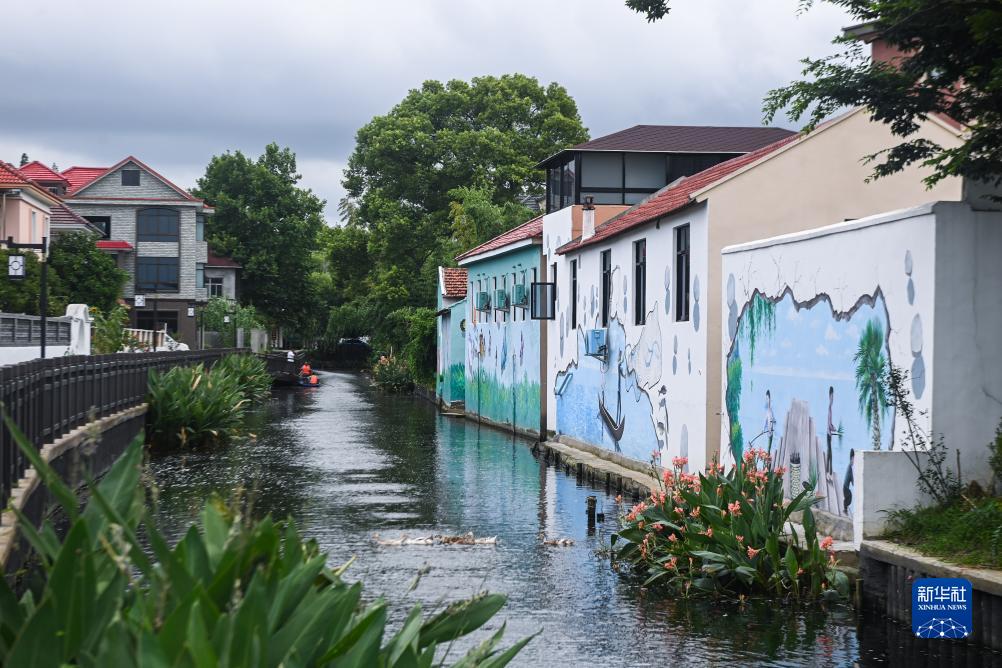 清澈的河道與精致的墻繪構成了嘉興市南湖區新豐鎮竹林村的美麗鄉村新畫(huà)卷(7月27日攝)。