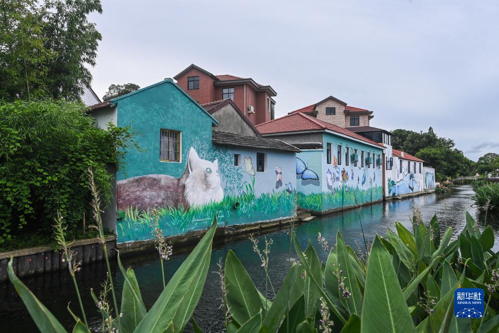 清澈的河道與精致的墻繪構成了嘉興市南湖區新豐鎮竹林村的美麗鄉村新畫(huà)卷(7月27日攝)。